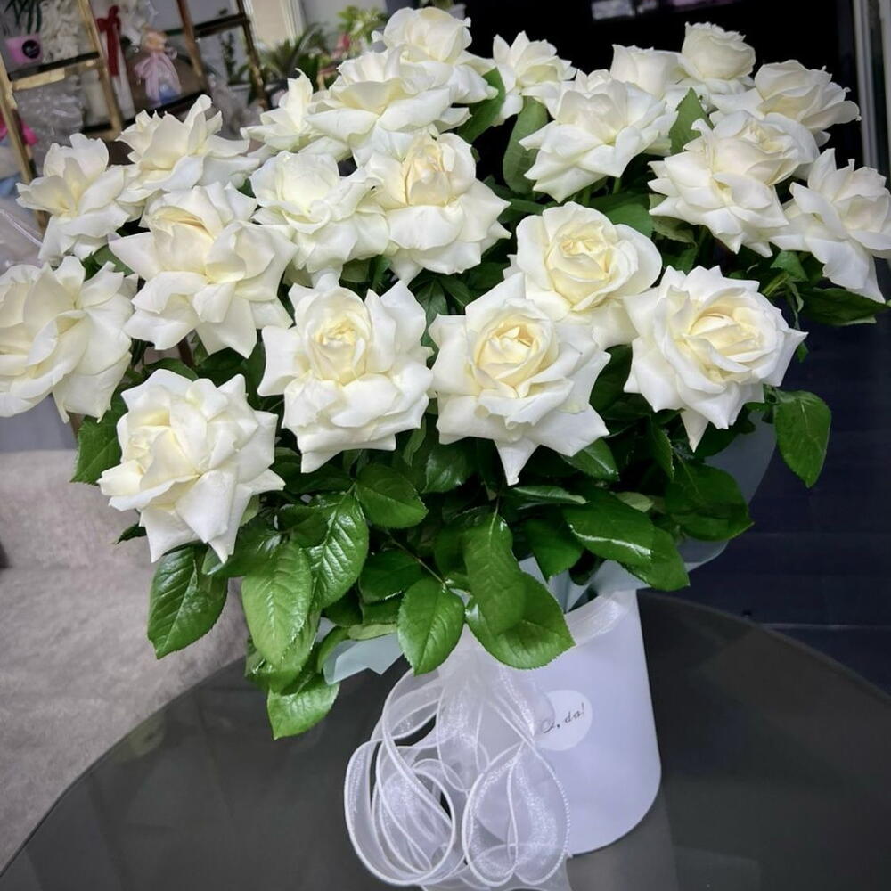Белые розы в коробке на флористической губке , выполненные во французской флористической технике 25 штук . Смотрятся элегантно и актуальны по любому поводу и в любое время года . Наслаждайтесь !