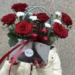 Эта композиция уникальна своей универсальностью. Классика красных роз, классика белых гвоздик ни чему не обязывают, подчеркивая интеллигентность взгляда, чистоту намерений приглашения на свидание, на встречу, на сотрудничество, на дружбу и общение. Цветы находятся на красиво задекорированном оазисе, что удобно при вручении, при транспортировке и без особых хлопот могут быть в сохранности на столе, в офисе, дома, в кабинете. Наполнят помещение и ваши отношения энергией красного, чистотой белого и магией зеркальности! Наслаждайтесь!