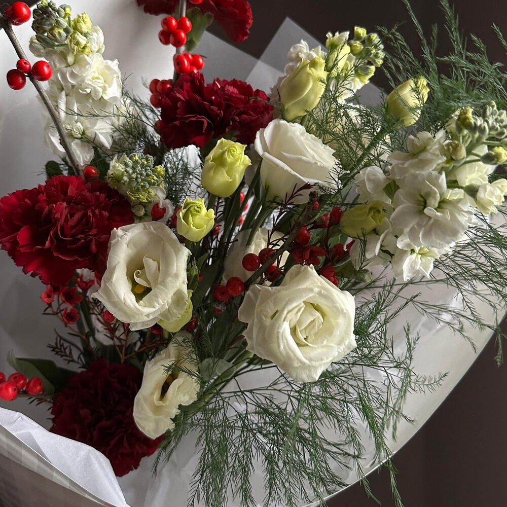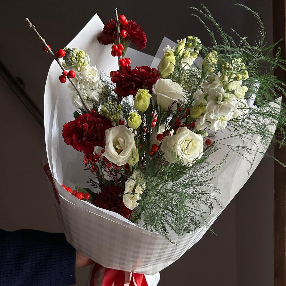 Илекс - 1 шт. Маттиола - 3 шт. Эустома - 3 шт. Диантус - 4 шт.