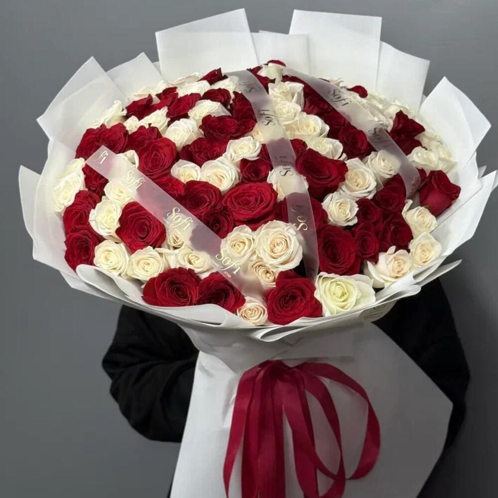 Шикарный букет из 101 голландской розы. Цвет роз можно поменять при заказе. Открытка и кризал в подарок!