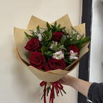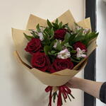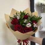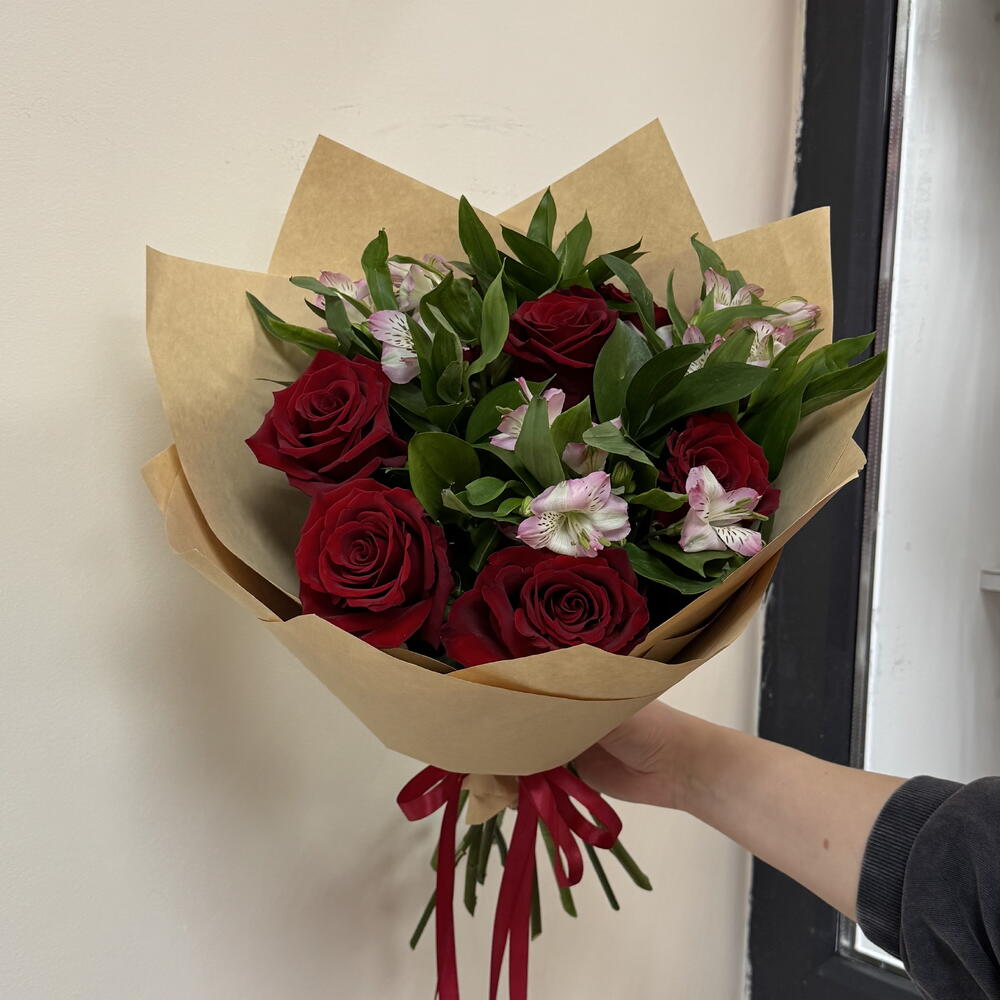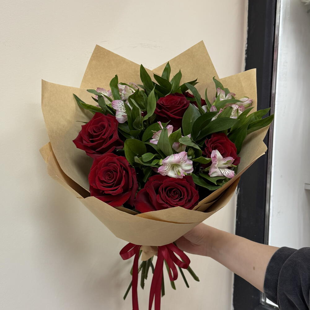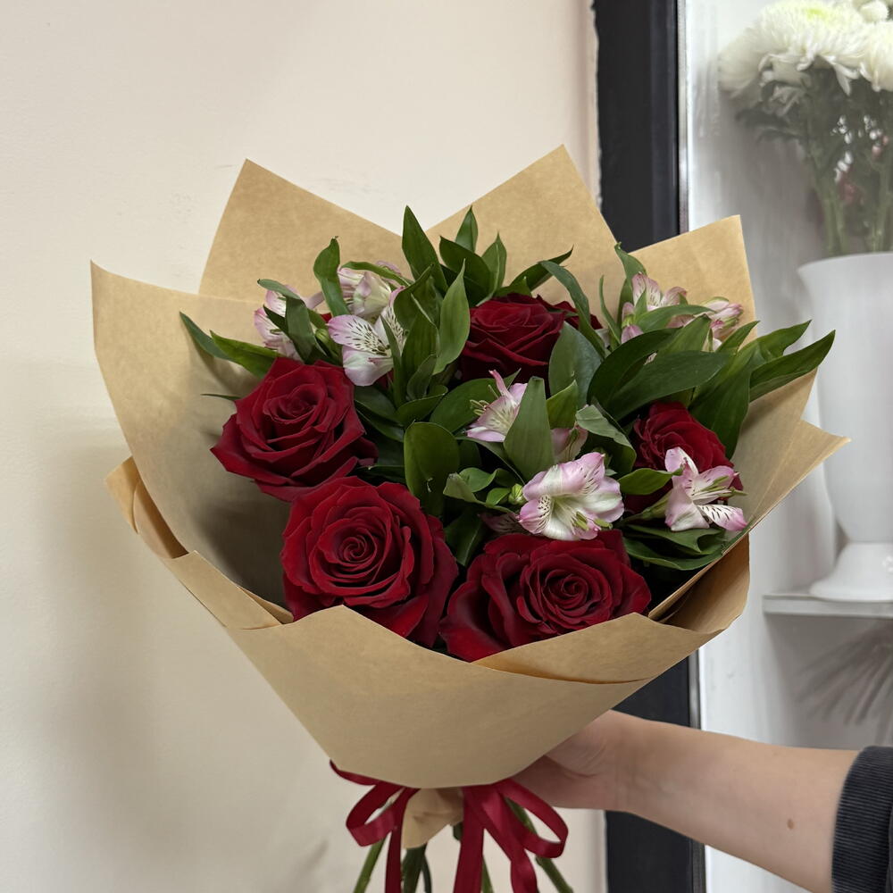 Роза красная - 7 шт. Рускус - 2 шт. Лента атласная - 120 см алмьтромерия - 5 шт. Крафт Бурый - 2 шт.