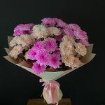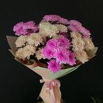 Хризантема кустовая - 7 шт. Лента атласная - 2 шт. Слюда упаковка - 2 шт. Оформление матовая пленка - 1 шт. открытка с вашими пожеланиями - 1 шт.