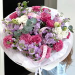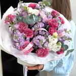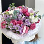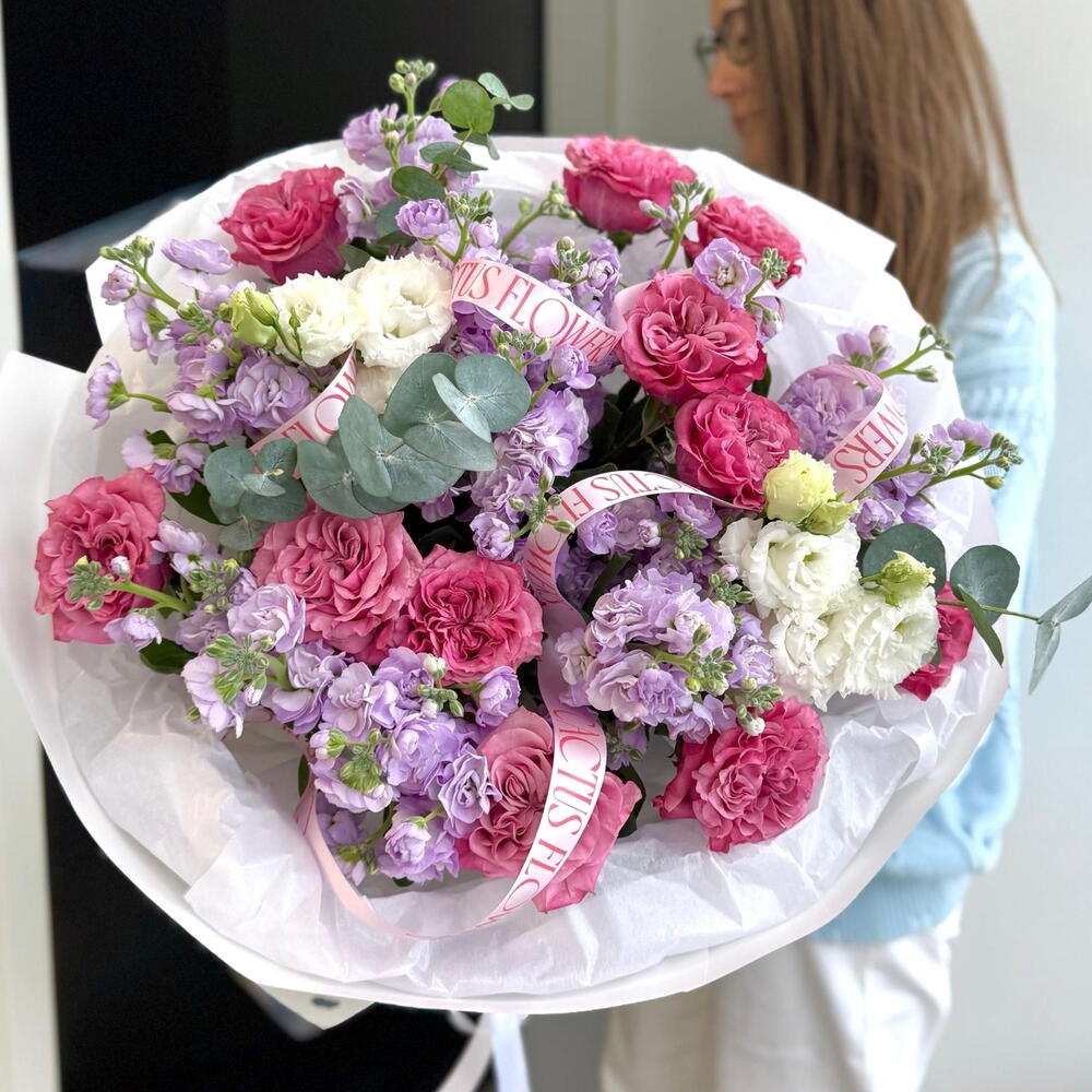Маттиола - 9 шт. Эустома - 2 шт. Роза эквадор пионовидная - 11 шт. эвкалипт беби блум - 1 шт.