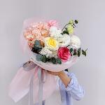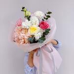 Гортензия - 1 шт. Эвкалипт - 1 шт. Роза - 3 шт. Эустома - 1 шт. Диантус - 3 шт.