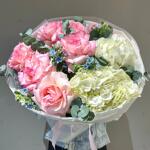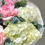 Вывернутые французские розы, белая гортензия и аромат эвкалипта — утончённый букет в европейском стиле. Для романтичного и запоминающегося подарка.