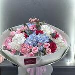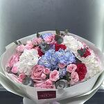 Гортензия - 5 шт. Эвкалипт - 7 шт. Кустовая роза - 7 шт. Гвоздика - 7 шт. Пионовидная роза - 7 шт.