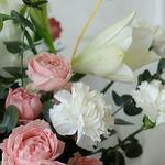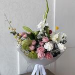 Краспедия - 1 шт. Лилия - 2 шт. Целозия - 2 шт. Кустовая роза - 3 шт. Гвоздика - 3 шт. Гладиолус - 1 шт. онцидиум - 1 шт.