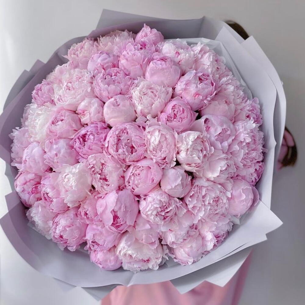 Пион - 51 шт. Упаковка дизайнерская - 5 шт. инструкция по уходу за цветами - 1 шт. открыточка в вашими пожеланиями - 1 шт. витамины для цветов (кризал) - 1 шт.