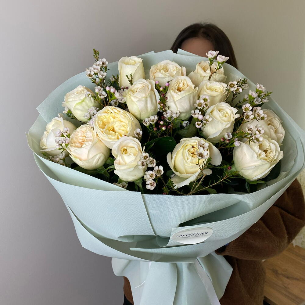 Пионовидная роза - 15 шт. Ваксфлауэр белый - 7 шт.