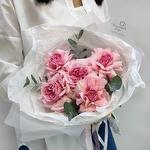 Ароматная пионовидная роза пинк охара, украшенная веточками эвкалипта. Указаны примерные размеры, чтобы вы могли представить внешний вид и масштаб, но фактически размеры могут немного отличаться.