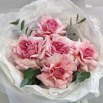 Эвкалипт - 3 шт. Роза - 5 шт. Лента атласная - 2 шт. Дизайнерская упаковка - 4 шт.
