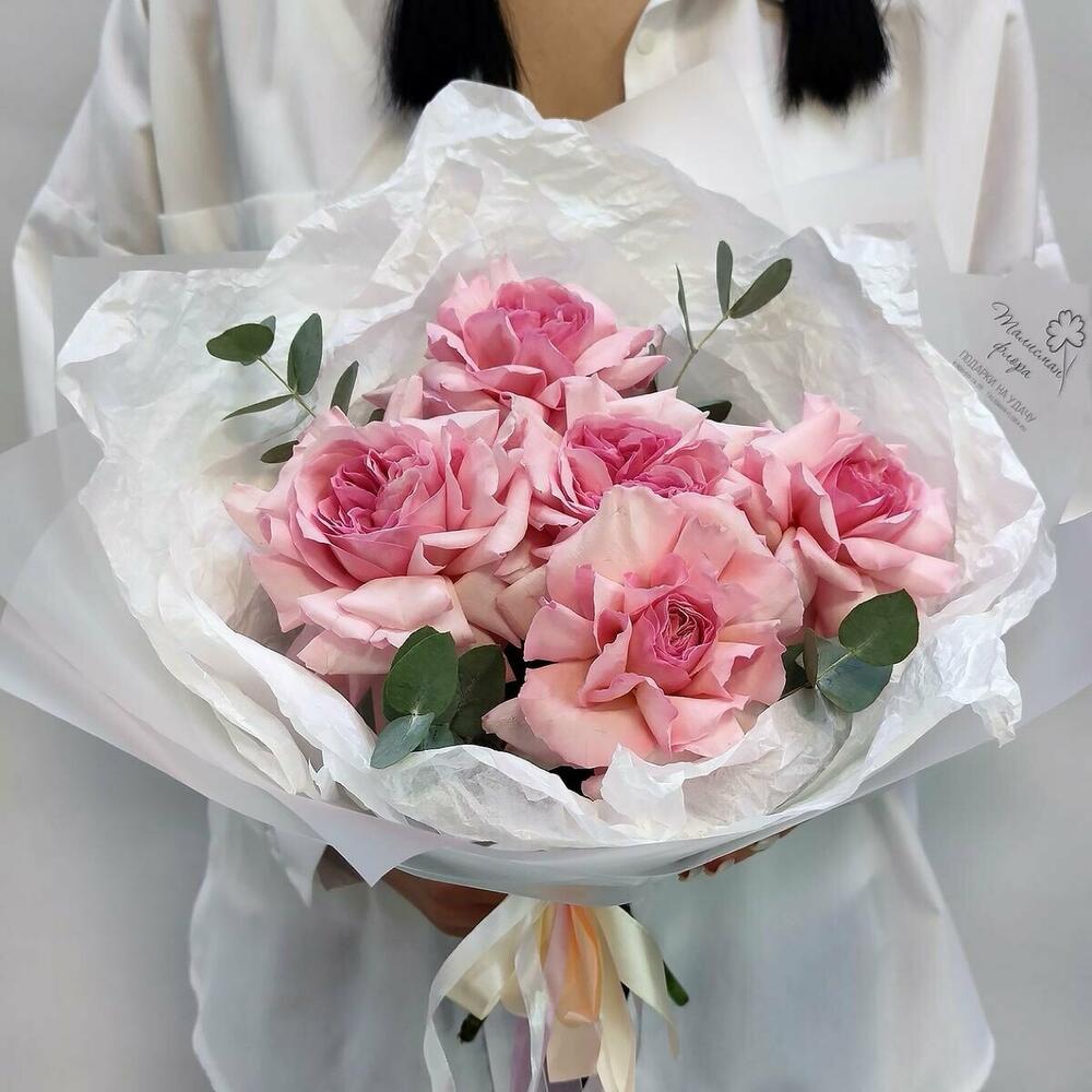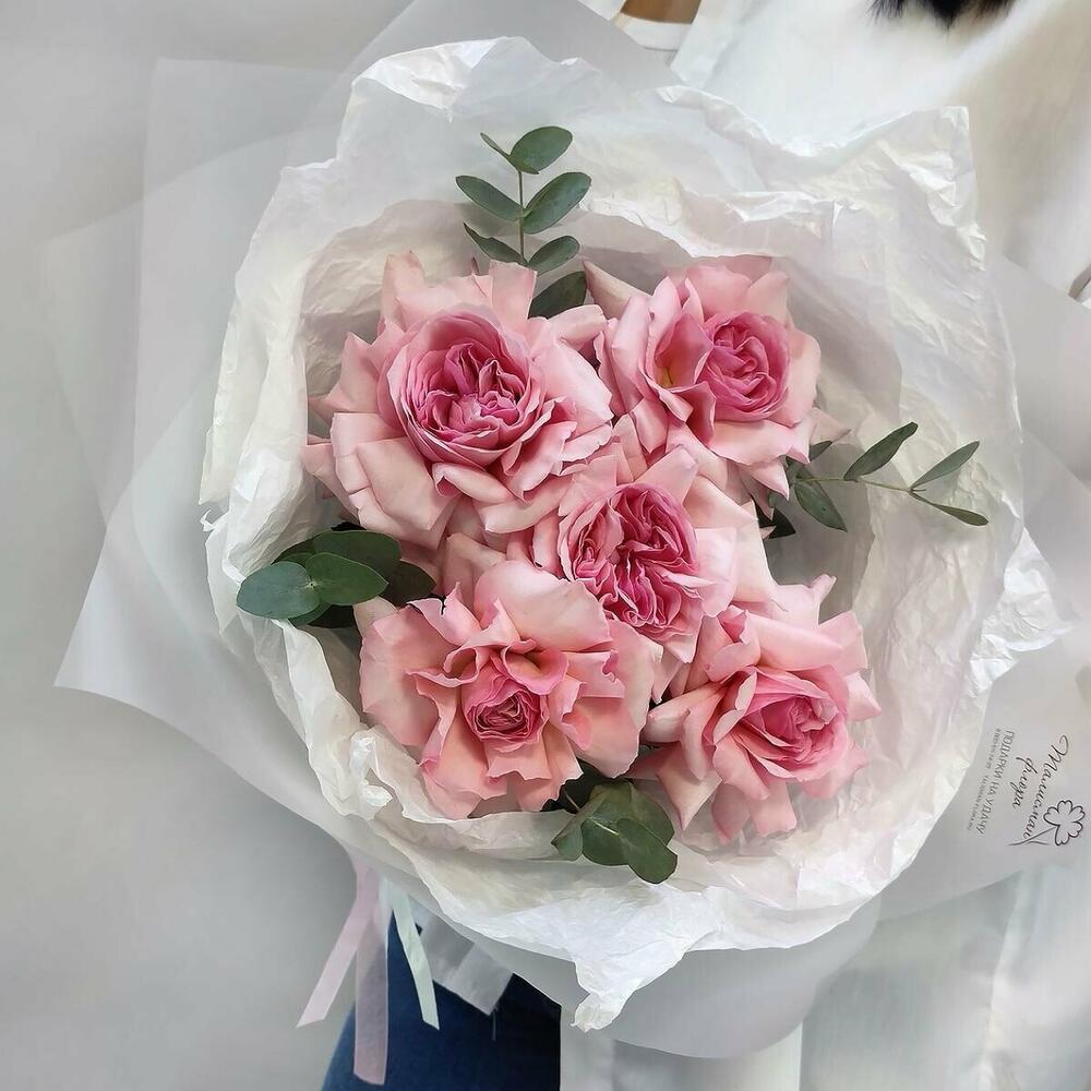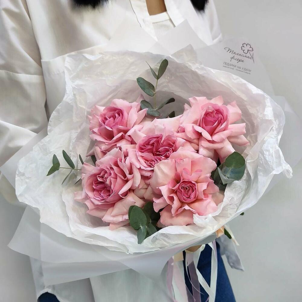 Эвкалипт - 3 шт. Роза - 5 шт. Лента атласная - 2 шт. Дизайнерская упаковка - 4 шт.