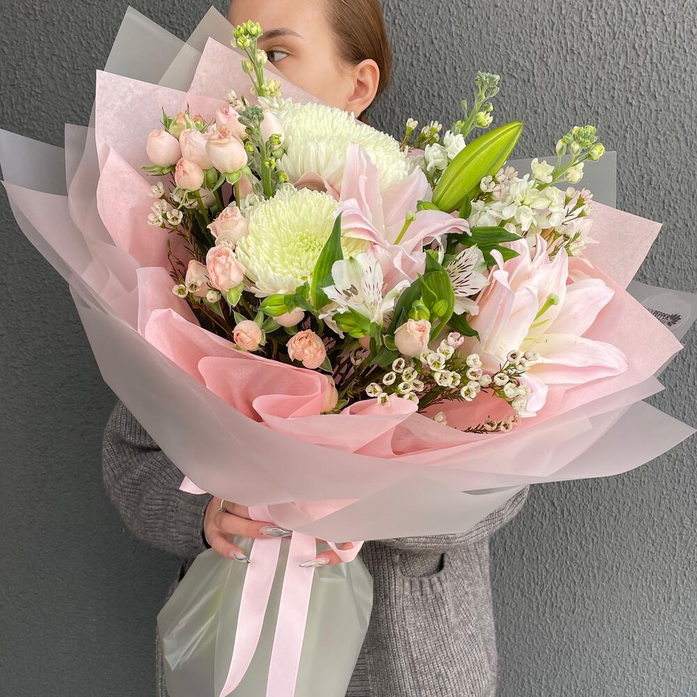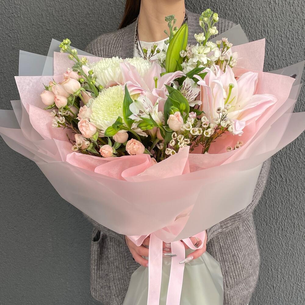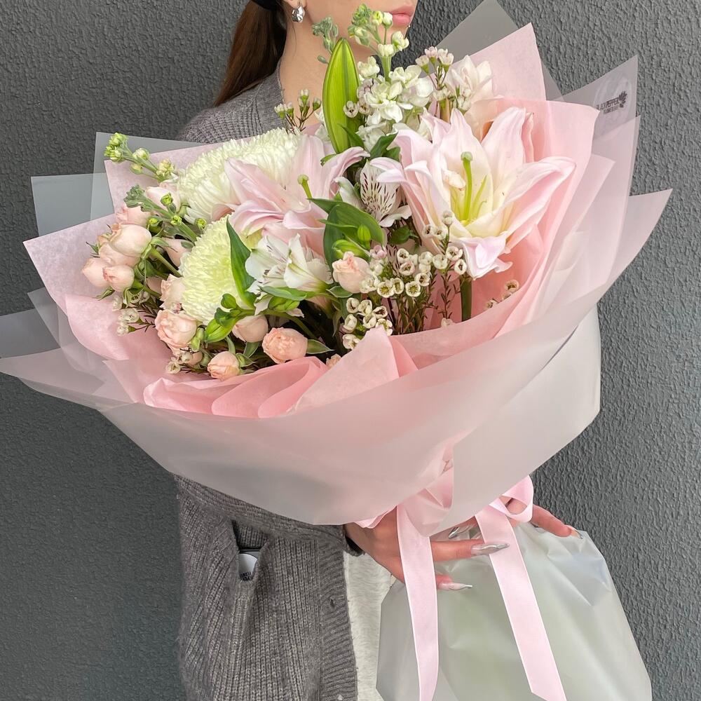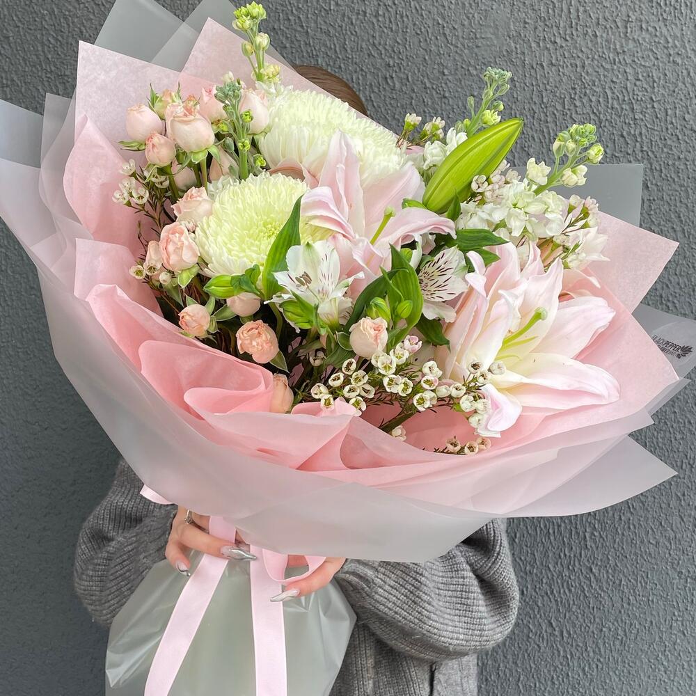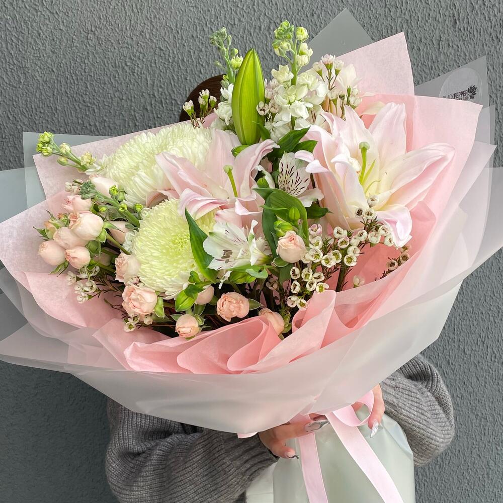 Альстромерия - 1 шт. Лилия - 1 шт. Маттиола - 3 шт. Кустовая роза - 3 шт. Хризантема - 2 шт.