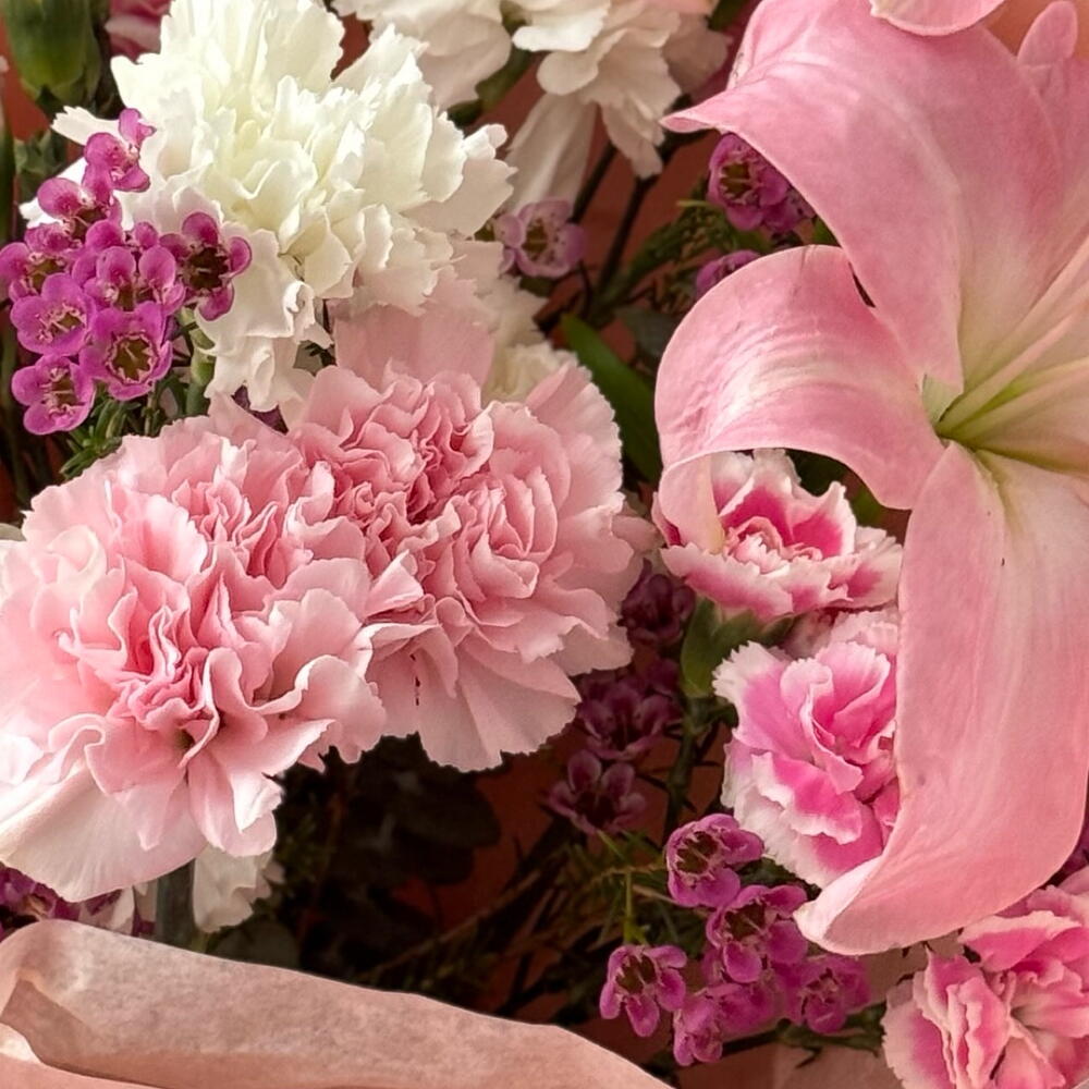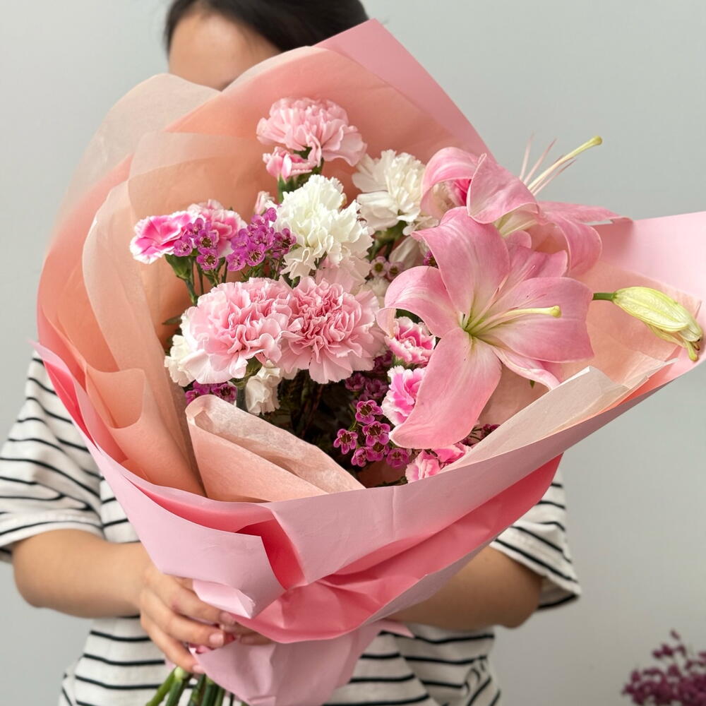 Wax flowers - 2 шт. diantus - 8 шт. lily pink - 1 шт. spray diantus - 4 шт. efcaliptus - 2 шт.
