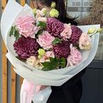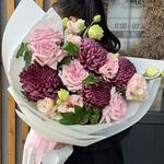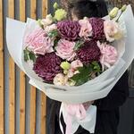 Роза - 4 шт. Эустома - 5 шт. Хризантема одноголовая - 4 шт. Малина - 2 шт.