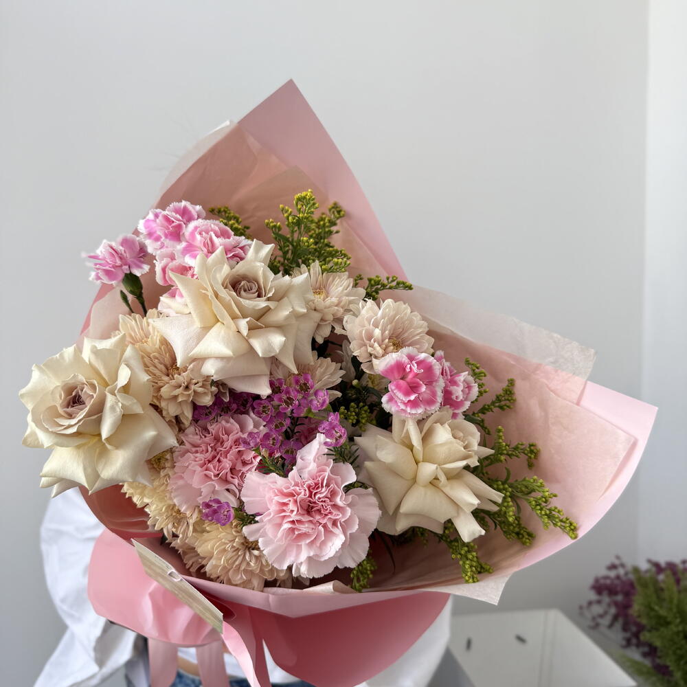 Ваксфлауэр - 3 шт. Солидаго - 2 шт. Хризантема кустовая - 4 шт. Диантус - 3 шт. диантус спрей - 3 шт. розы белые - 3 шт.