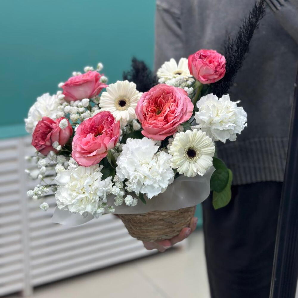 Гипсофила - 2 шт. Гербера - 3 шт. Диантус - 5 шт. Роза пионовидная - 5 шт.