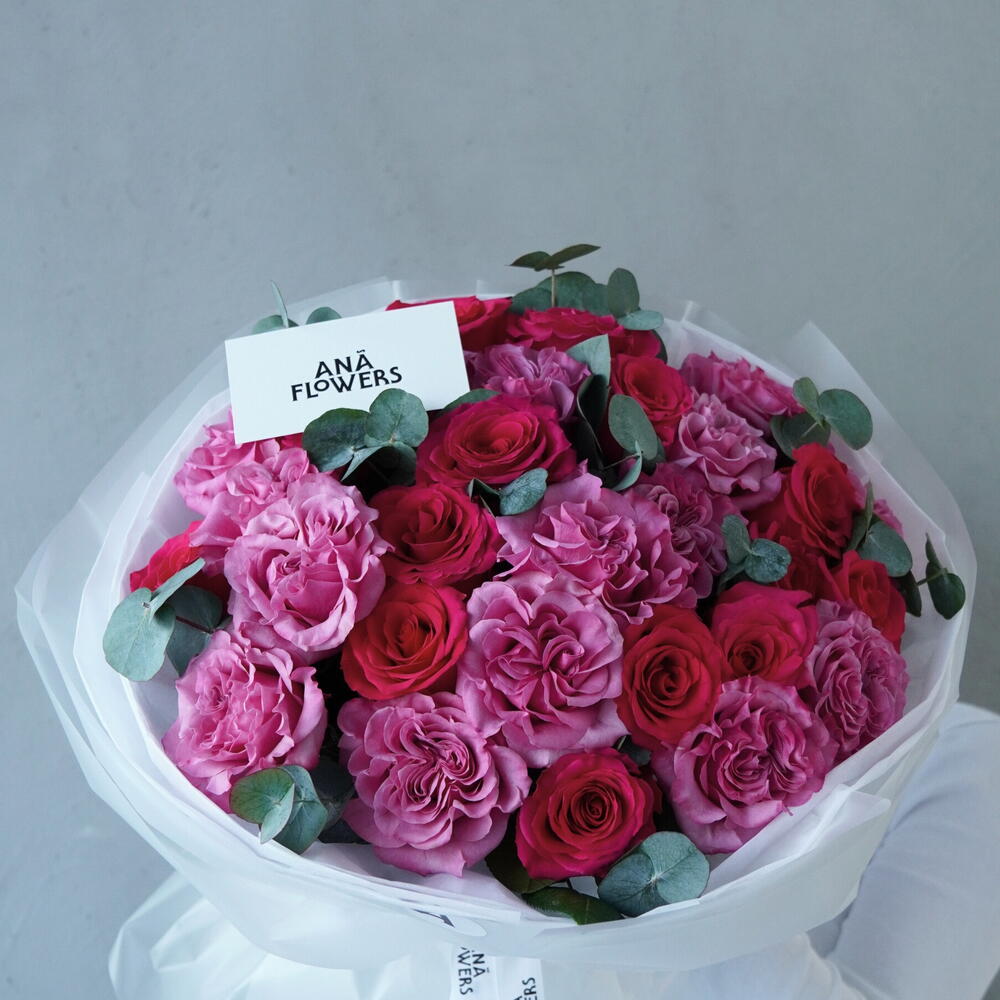 Роза - 13 шт. Упаковка дизайнерская - 1 шт. Эвкалипт Цинерея - 1 шт. country blues роза пионовидная - 12 шт.