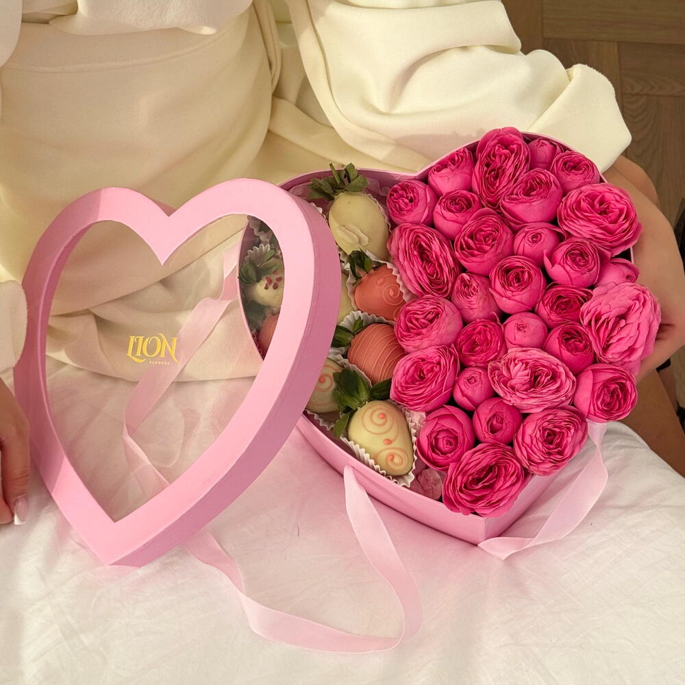 Пионовидные кустовые розы в коробке в форме сердца