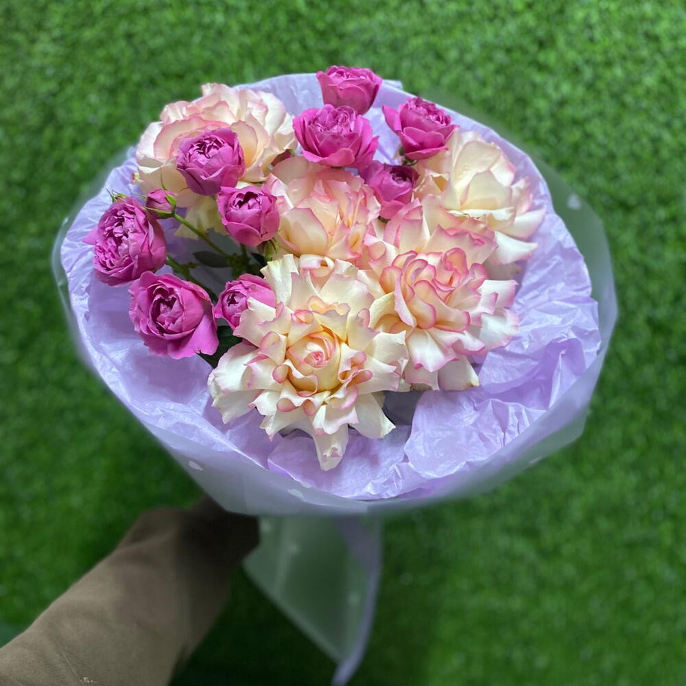 Роза кустовая пионовидная - 2 шт. Упаковка дизайнерская - 4 шт. Роза французская розовая - 5 шт.