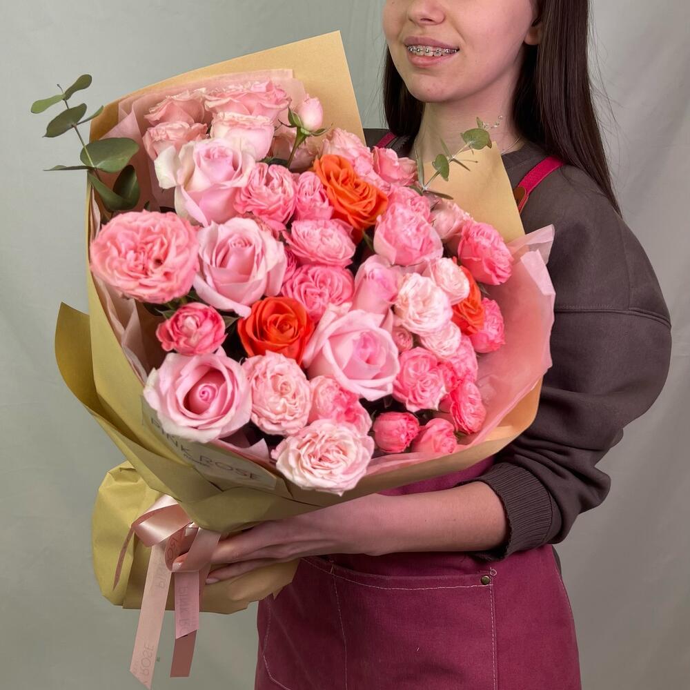 Эвкалипт - 3 шт. Роза - 6 шт. пионовидные кустовые розы - 9 шт.
