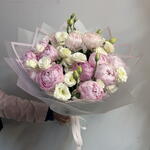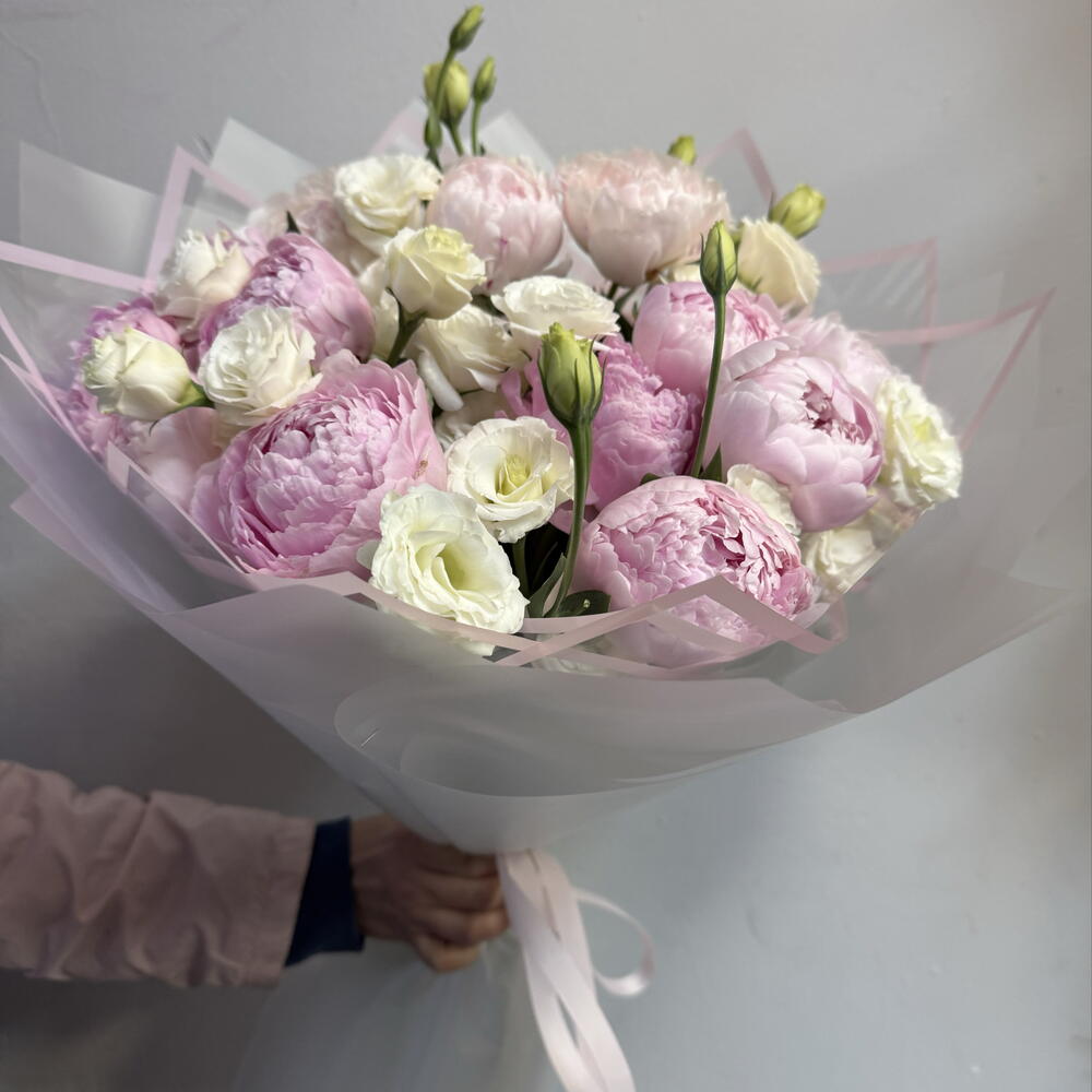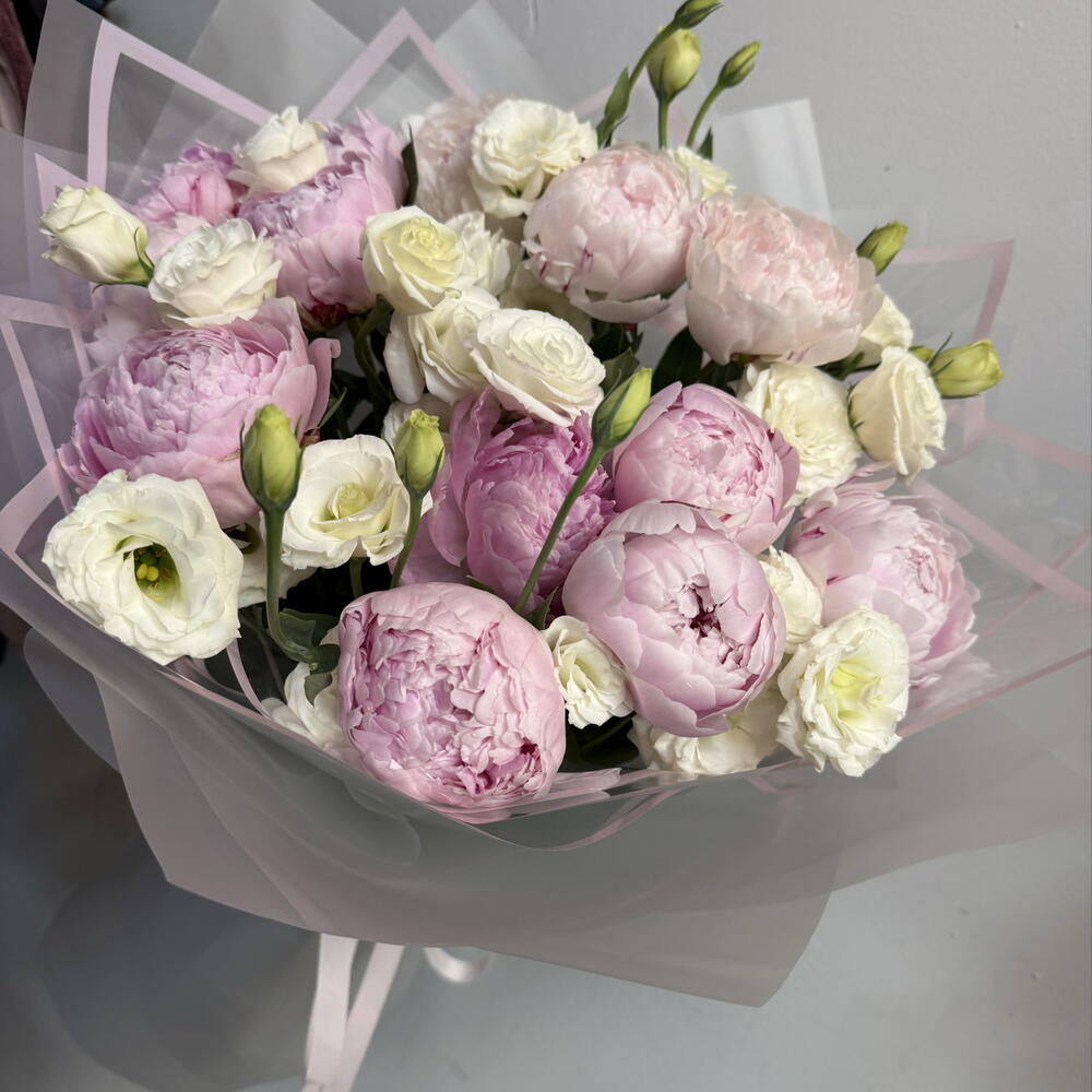 Лента - 1 шт. Пион - 13 шт. эустома белая - 6 шт. бумага матовая - 6 шт.
