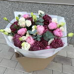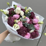 Пион - 7 шт. Эустома - 7 шт. Эвкалипт Цинерея - 2 шт. бигуди хризантема - 9 шт.