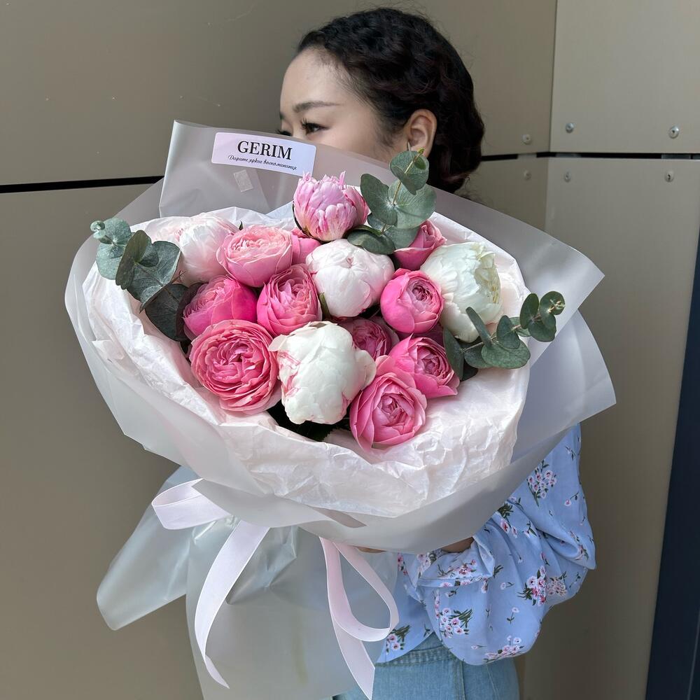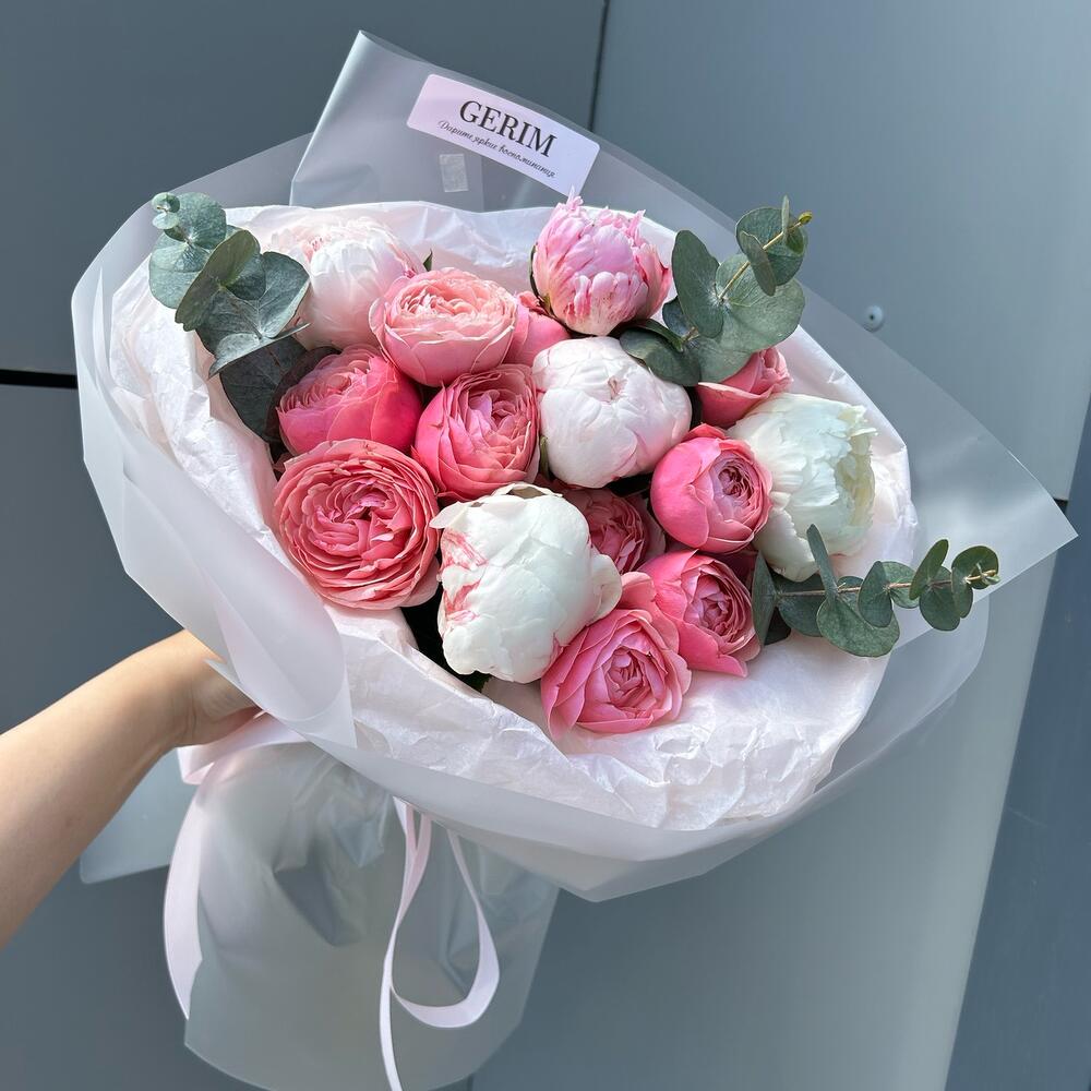 Пион - 5 шт. Эвкалипт - 1 шт. Кустовая роза - 4 шт.