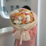 Этот авторский букет из семи светящихся головок диантуса, пяти радужных спрей-роз и четырех пышных кустовых хризантем поднимет настроение и откроет для вас мир незабываемых цветочных ароматов. Идеальное сочетание этих цветов создает гармоничное и завораживающее впечатление, добавляя в ваше пространство касание естественной красоты. Этот букет - истинное произведение искусства, которое принесет радость и счастье в каждый дом.
