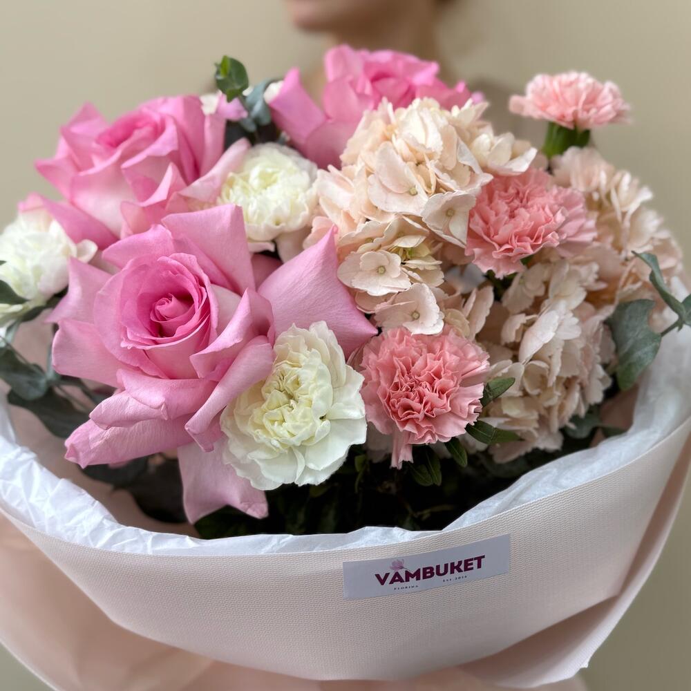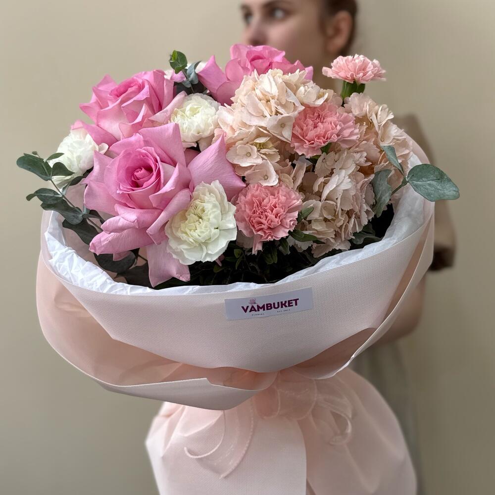 Гортензия - 1 шт. Эвкалипт - 2 шт. Диантус - 6 шт. розы - 3 шт.