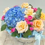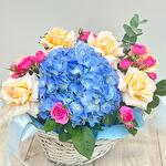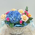 Роза кустовая - 3 шт. Эвкалипт - 1 шт. Роза - 7 шт. Лента атласная - 1 шт. Корзина плетеная - 1 шт. Гортензия голубая - 1 шт. Оазис флористический - 3 шт.