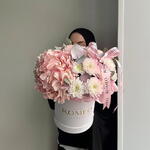 Гортензия - 1 шт. Лента - 1 шт. Хризантема кустовая - 3 шт. Эвкалипт - 1 шт. Оазис - 1 шт. Коробка - 1 шт.