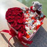 Роза - 19 шт. Раффаэлло - 1 шт. Киндер сюрприз - 3 шт. Киндер шоколад - 8 шт. чокобонс - 5 шт. тедди плюшевые мишки - 1 шт. буено - 3 шт.