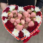 Хризантема кустовая - 2 шт. Киндер шоколад - 4 шт. Киндер макси - 45 шт. Клубника в шоколаде - 20 шт. Коробка сердце большая - 1 шт. розы - 15 шт.