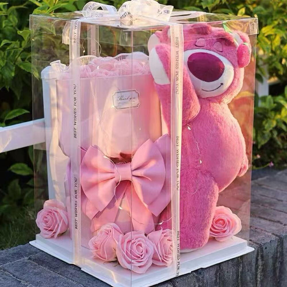 Элегантный подарочный бокс с плюшевым мишкой и букетом малиновых роз — идеальное сочетание нежности и романтики. Композиция оформлена в прозрачной коробке с декоративной лентой и тёплой подсветкой, благодаря чему подарок выглядит эффектно и дорого с первого взгляда. Мягкий мишка символизирует заботу и тепло, а насыщенные малиновые розы подчёркивают чувства и делают подарок по-настоящему запоминающимся. Бокс полностью готов к вручению — дополнительная упаковка не требуется.