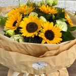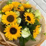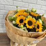 Эустома - 5 шт. Тишью - 3 шт. Подсолнух - 9 шт. Крафт - 4 шт. зелень декоративная пучок - 1 шт.