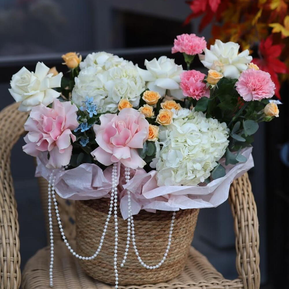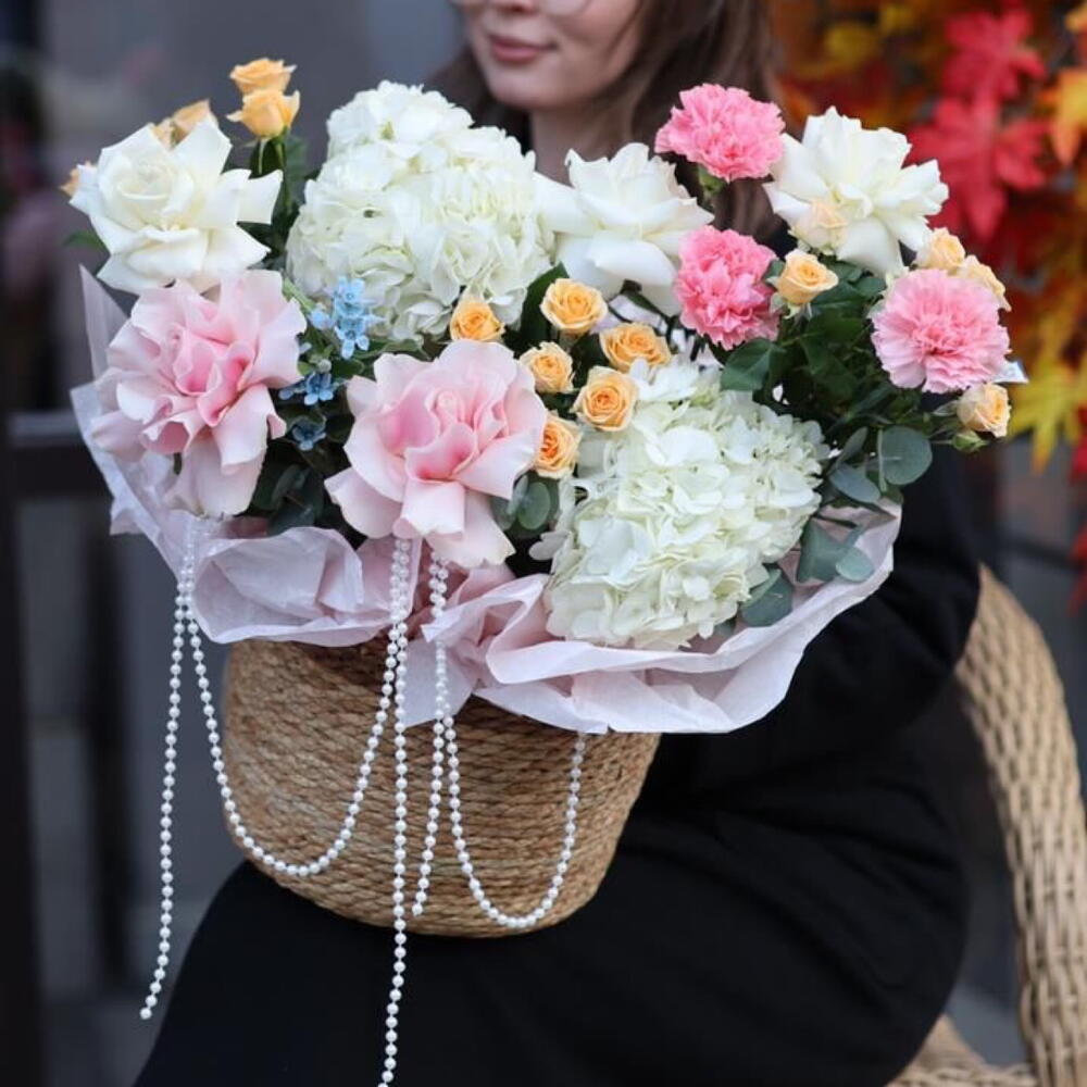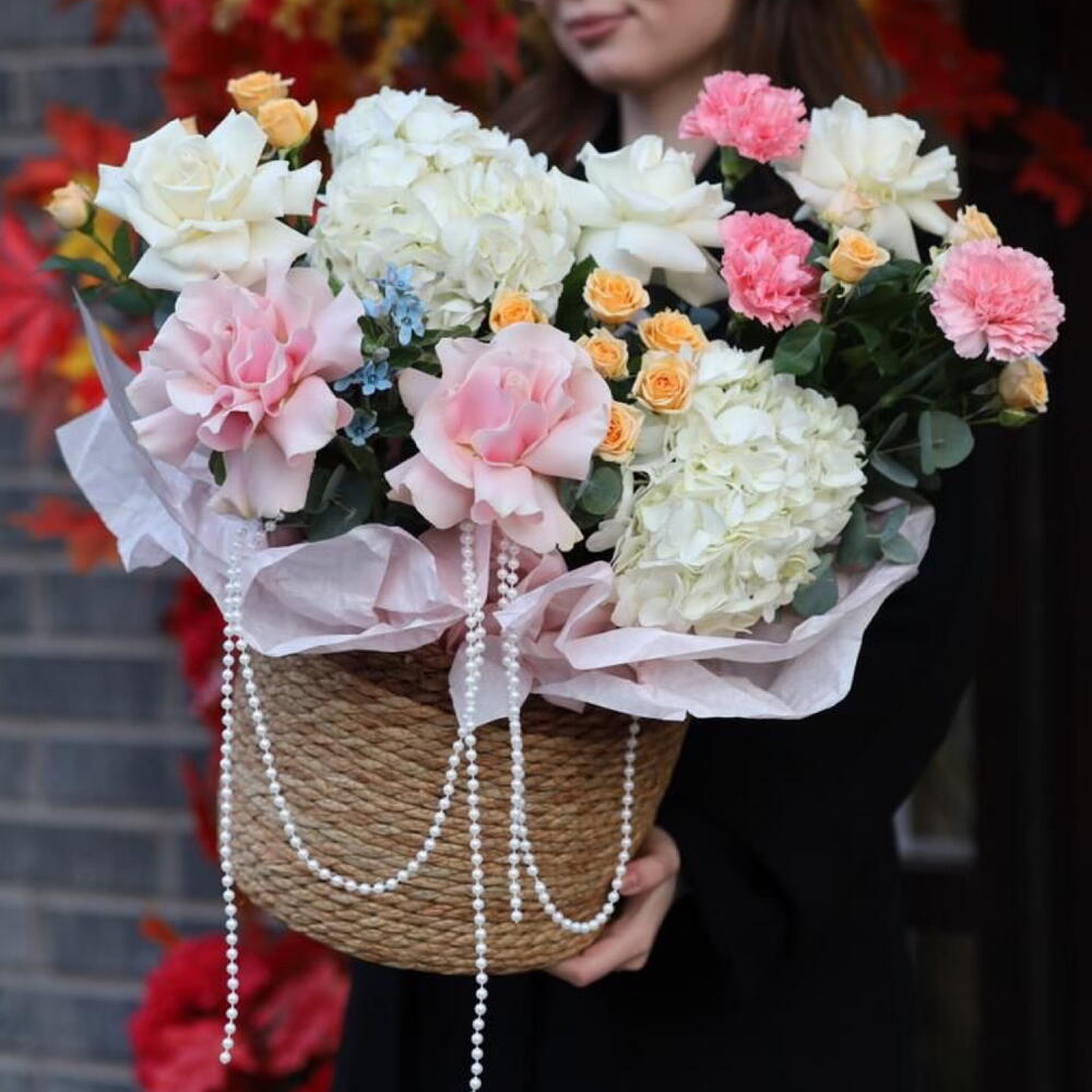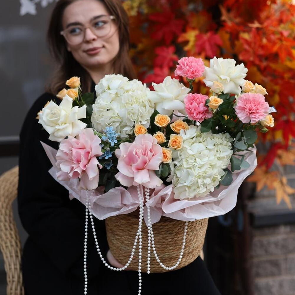 Гортензия - 2 шт. Роза - 5 шт. Кустовая роза - 3 шт. Диантус - 3 шт. Твидия - 1 шт.