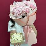Симпатичный букетик из роз и тортик. Состав торта: Мука в/с, разрыхлитель, яйцо, сгущенное молоко натуральное, клубника с/м, натуральные сливки 33 %, сливочный сыр маскарпоне, сливочное масло 82,5%, творожный сыр Hochland Cremette, сахарная пудра, краситель натуральный.