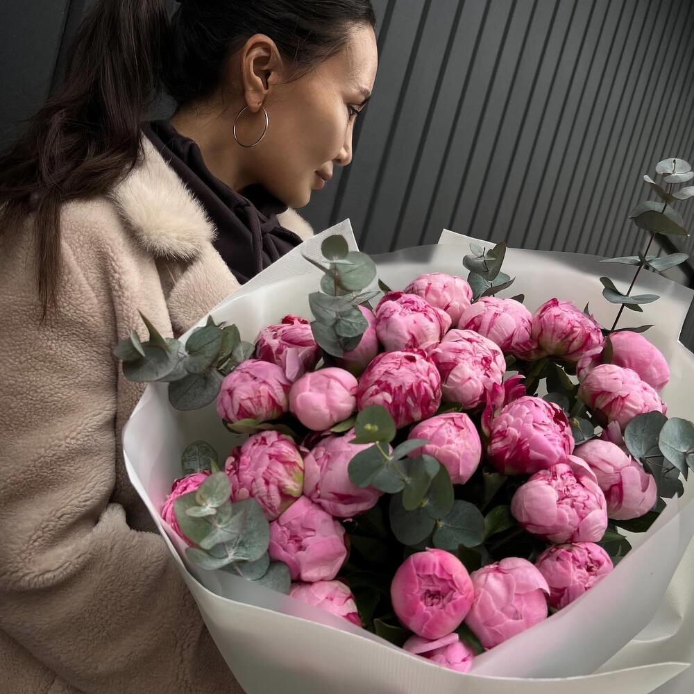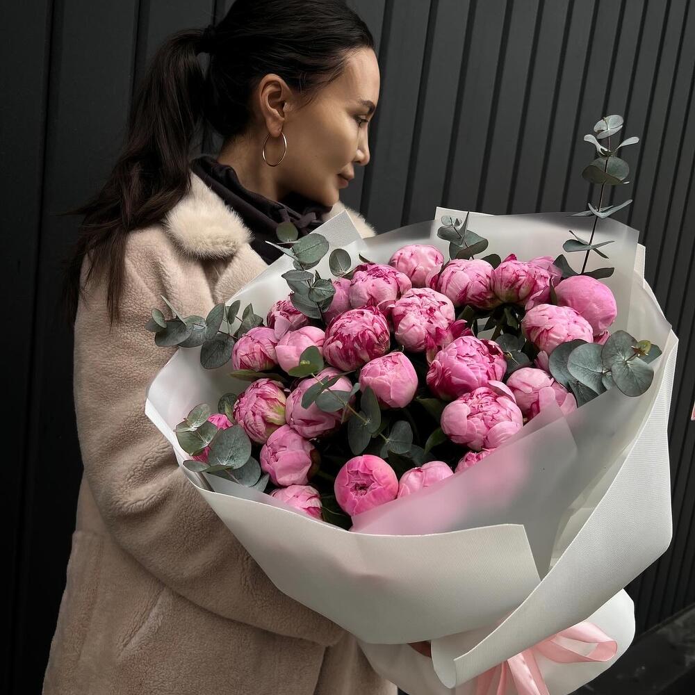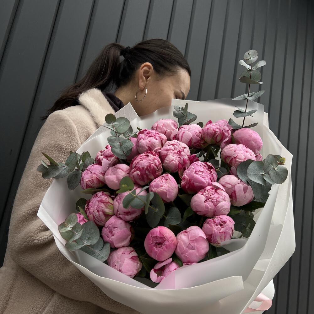Изысканный, пышный и воздушный букет, в котором классическая нежность пионов гармонично сочетается с изящной зеленью эвкалипта. 🌸 25 пионов — символ романтики, утончённости и женственности. Каждый цветок раскрывается по-своему, даря ощущение живого дыхания природы. 🌿 Эвкалипт добавляет лёгкости и свежести, наполняя букет природным ароматом и изысканной текстурой. ✅ Идеален для: – признания в любви, – дня рождения, – годовщины, – благодарности, – просто без повода — чтобы порадовать.