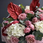 Премиум букет с Антуриумом, пионовидной кустовой розой и гортензией
