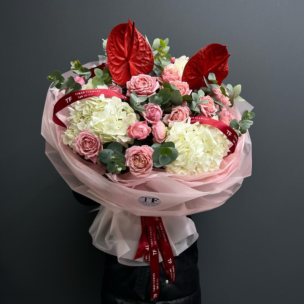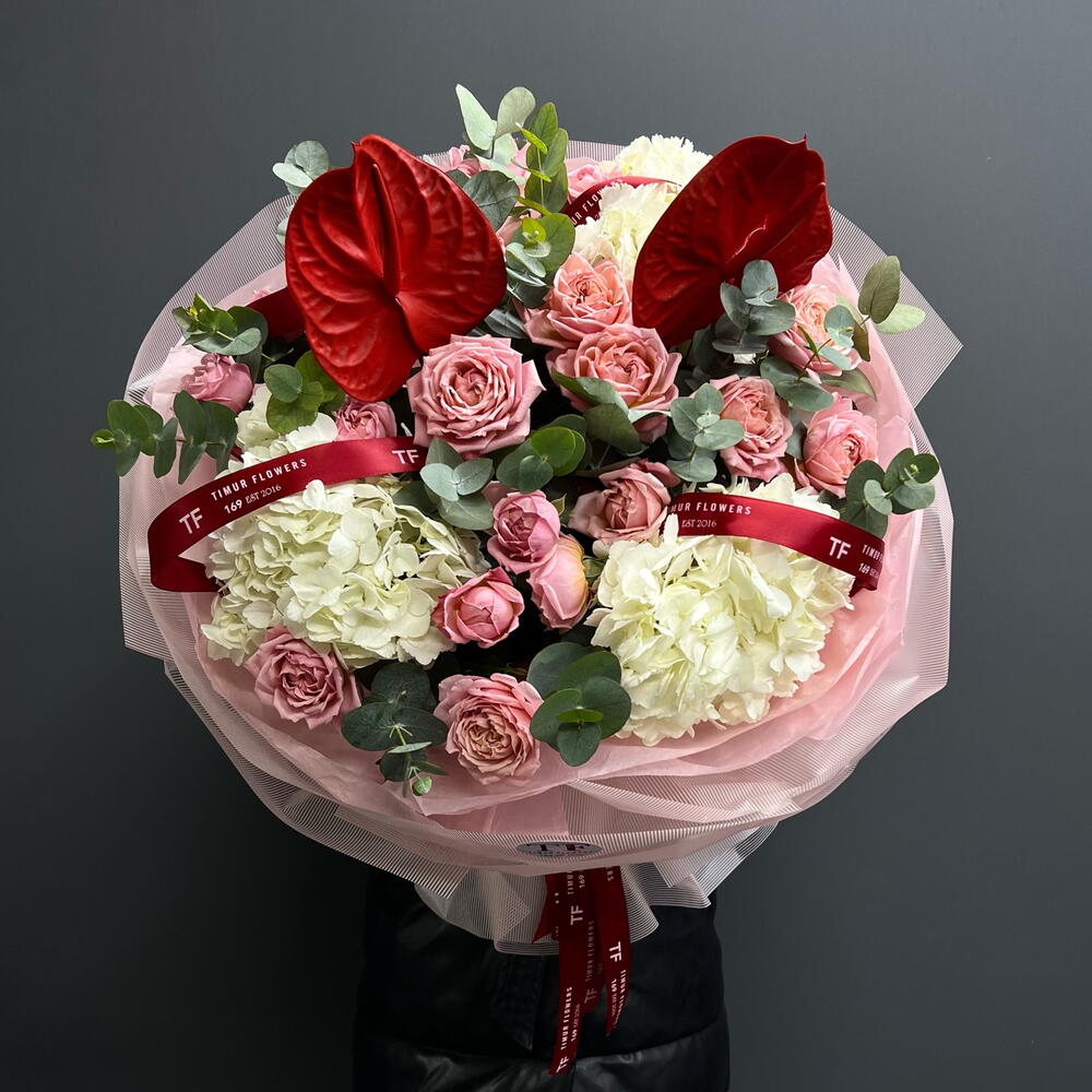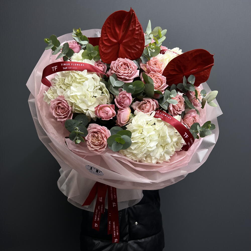 Премиум букет с Антуриумом, пионовидной кустовой розой и гортензией