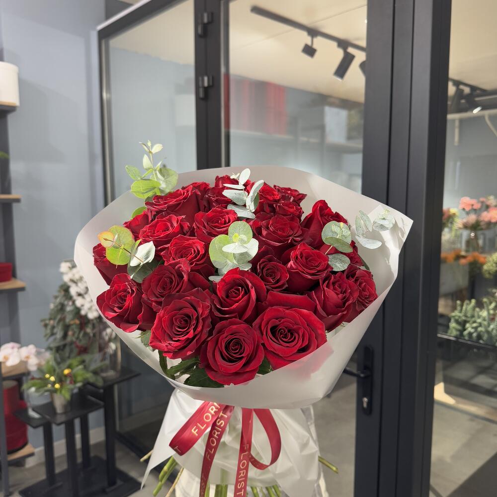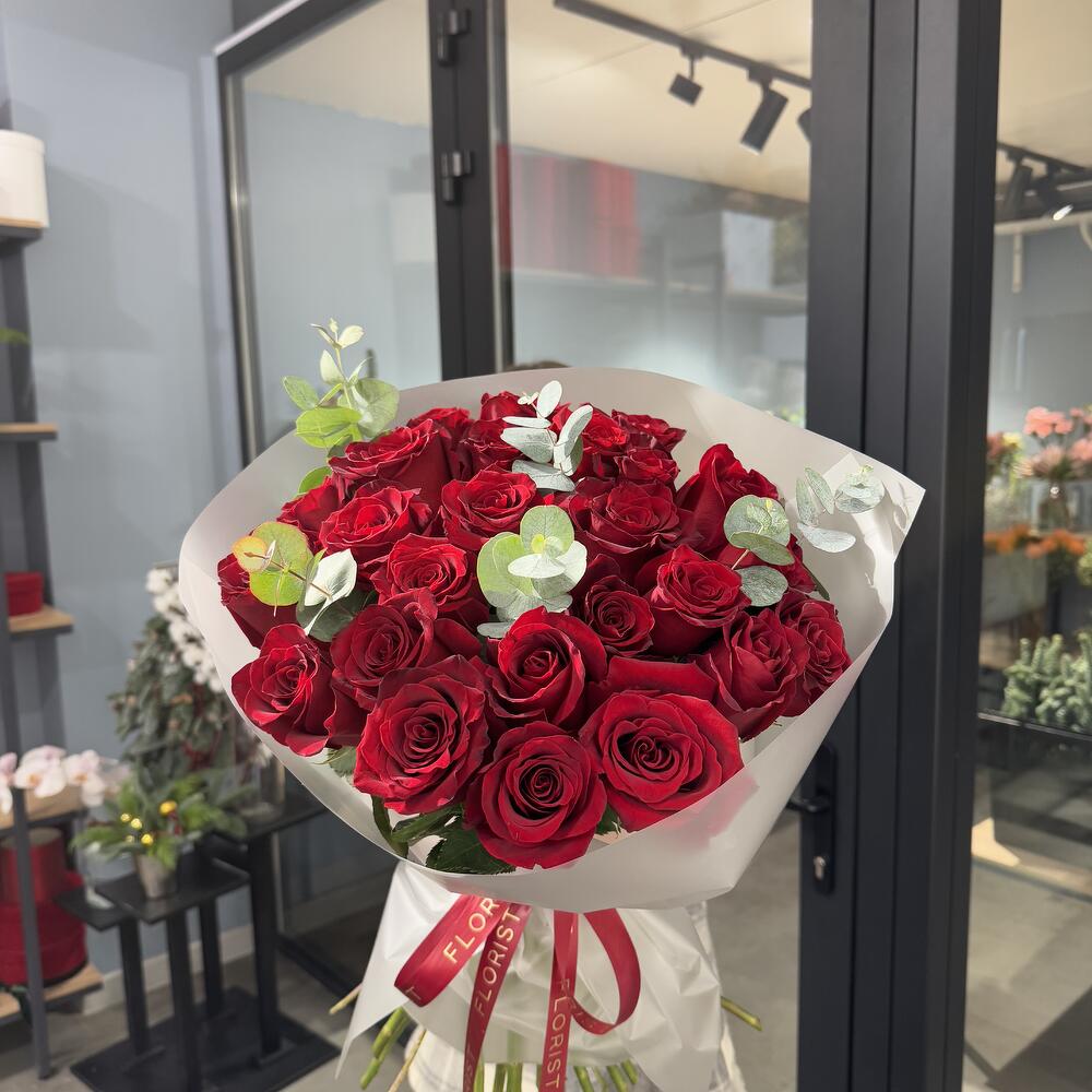 Эвкалипт - 6 шт. Лента атласная - 1 шт. Авторская упаковка - 1 шт. пакет переноска - 1 шт. открытка на выбор - 1 шт. витамины - 1 шт. роза колумбия премиум - 25 шт. аквбокс для свежести - 1 шт.
