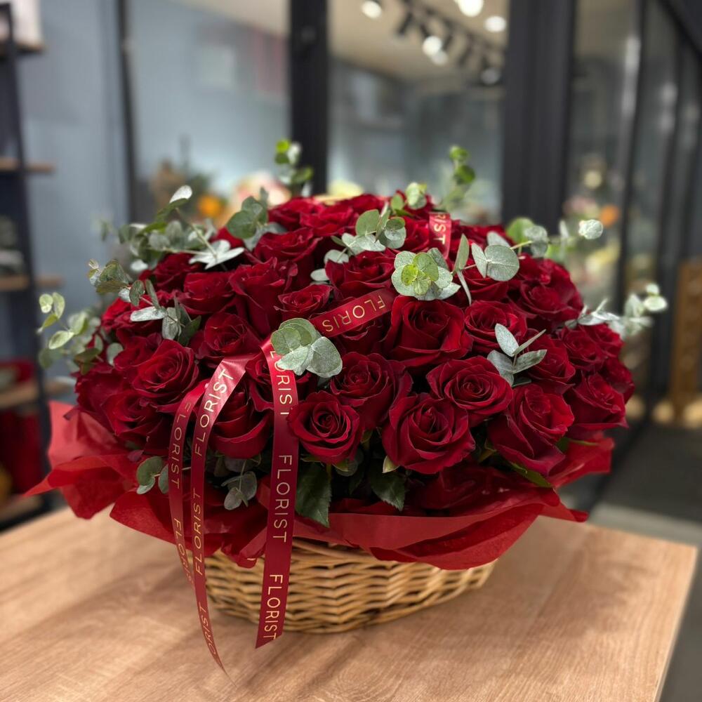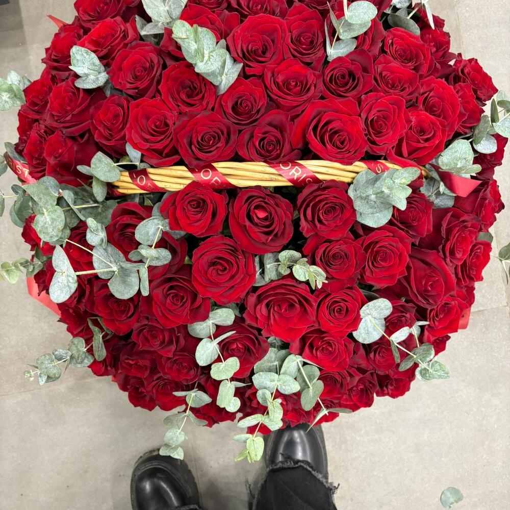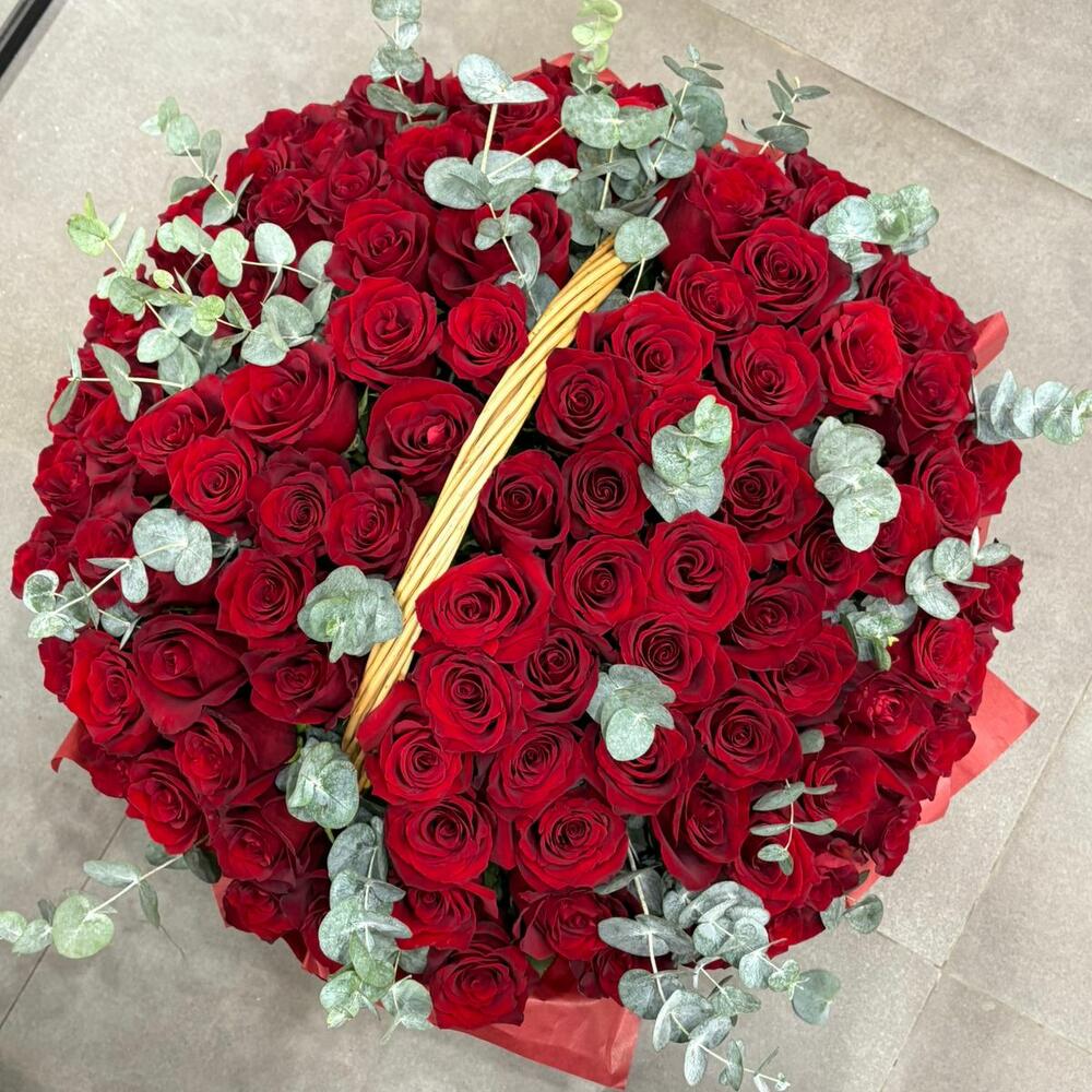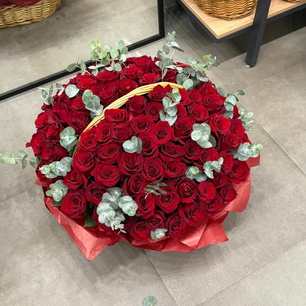 Эвкалипт - 15 шт. утеплитель - 2 шт. витамины для стойкости цветов - 1 шт. корзинка - 1 шт. открытка бесплатная на выбор - 1 шт. премиум роза колумбия - 101 шт. лента атласная бронированная - 2 шт.