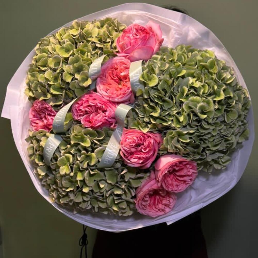 Гортензия - 3 шт. Оформление - 1 шт. роза пионовидная pink expression (эквадор) - 7 шт.