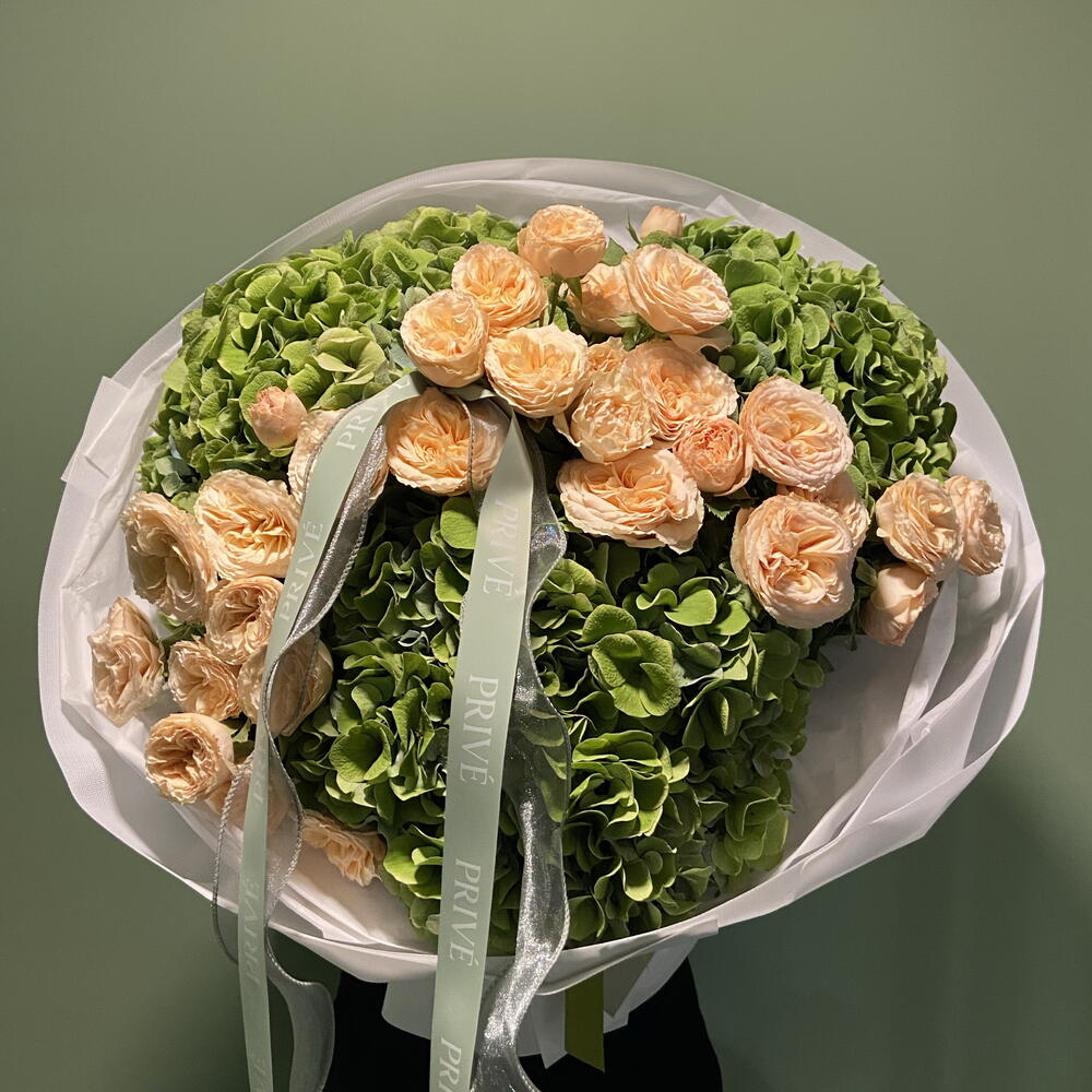 Гортензия - 3 шт. Оформление - 1 шт. gentle trendsetter роза пионовидная - 5 шт.