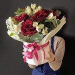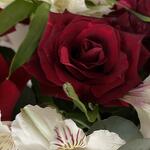 Альстромерия - 3 шт. Эвкалипт - 2 шт. Роза - 7 шт. Роза Эквадор - 7 шт. Лента атласная - 2 шт. Коробка шляпная - 1 шт. Открыточка с вашими пожеланиями - 1 шт. Оазис флористический - 1 шт.
