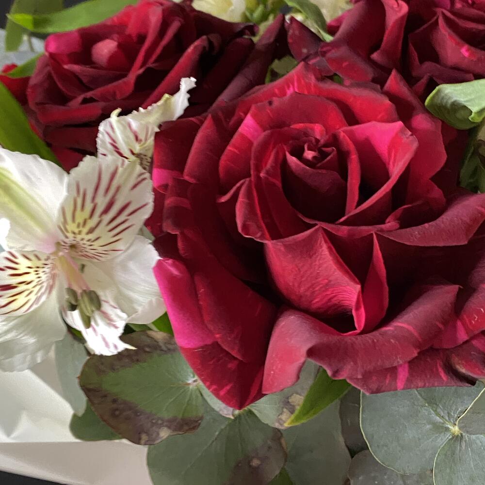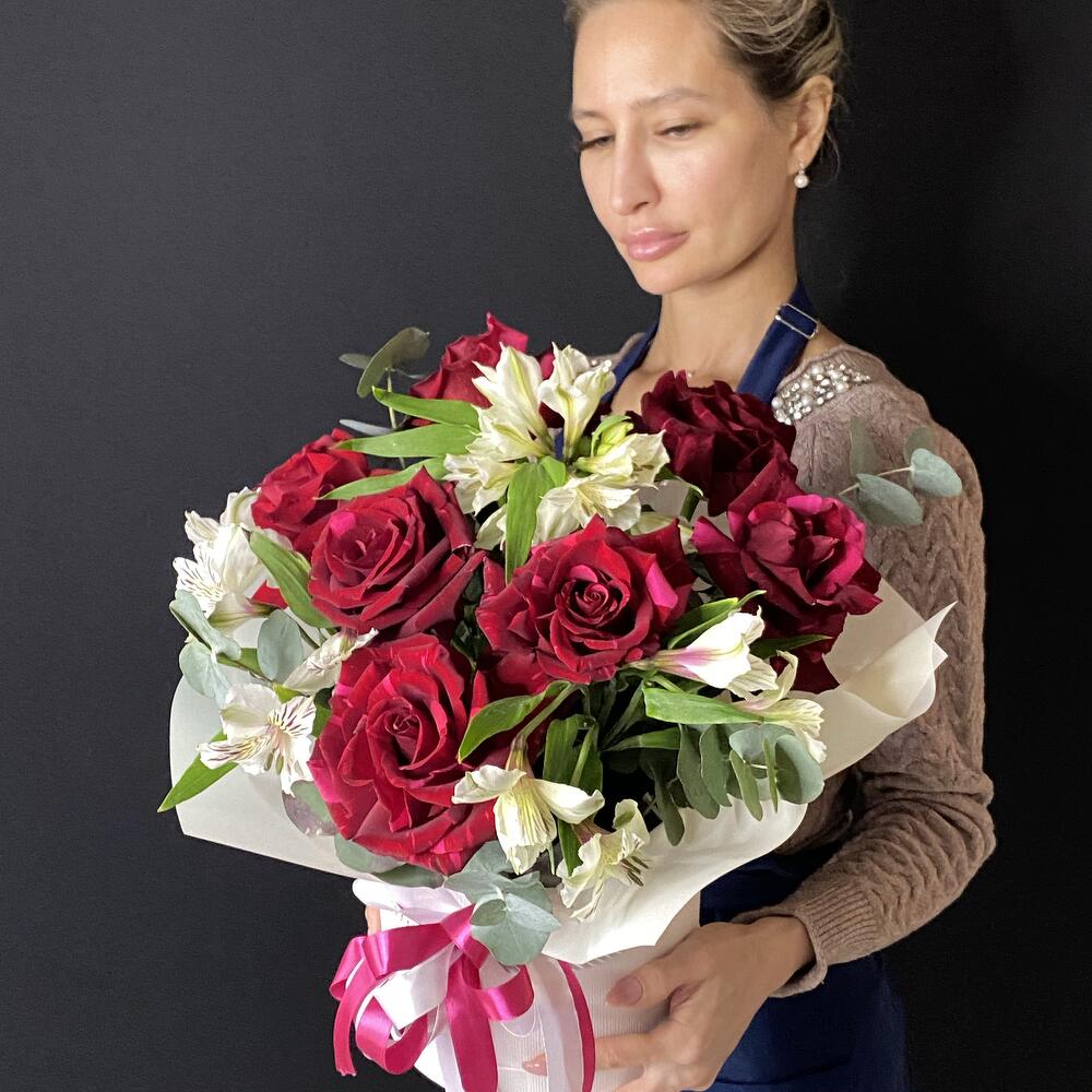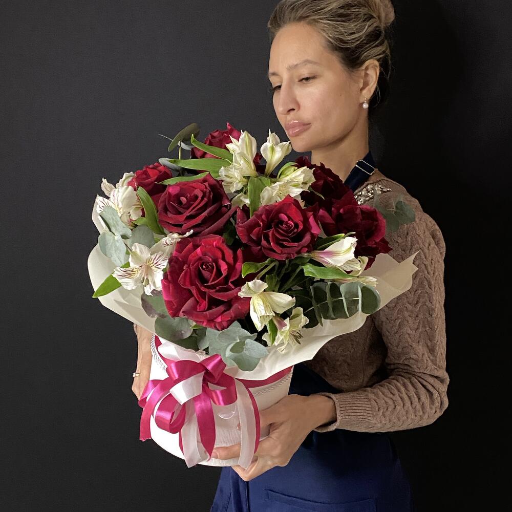 Альстромерия - 3 шт. Эвкалипт - 2 шт. Роза - 7 шт. Роза Эквадор - 7 шт. Лента атласная - 2 шт. Коробка шляпная - 1 шт. Открыточка с вашими пожеланиями - 1 шт. Оазис флористический - 1 шт.