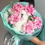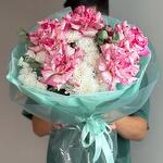 Хризантема кустовая - 5 шт. Эвкалипт - 5 шт. Роза французская - 5 шт. Оформление - 1 шт.
