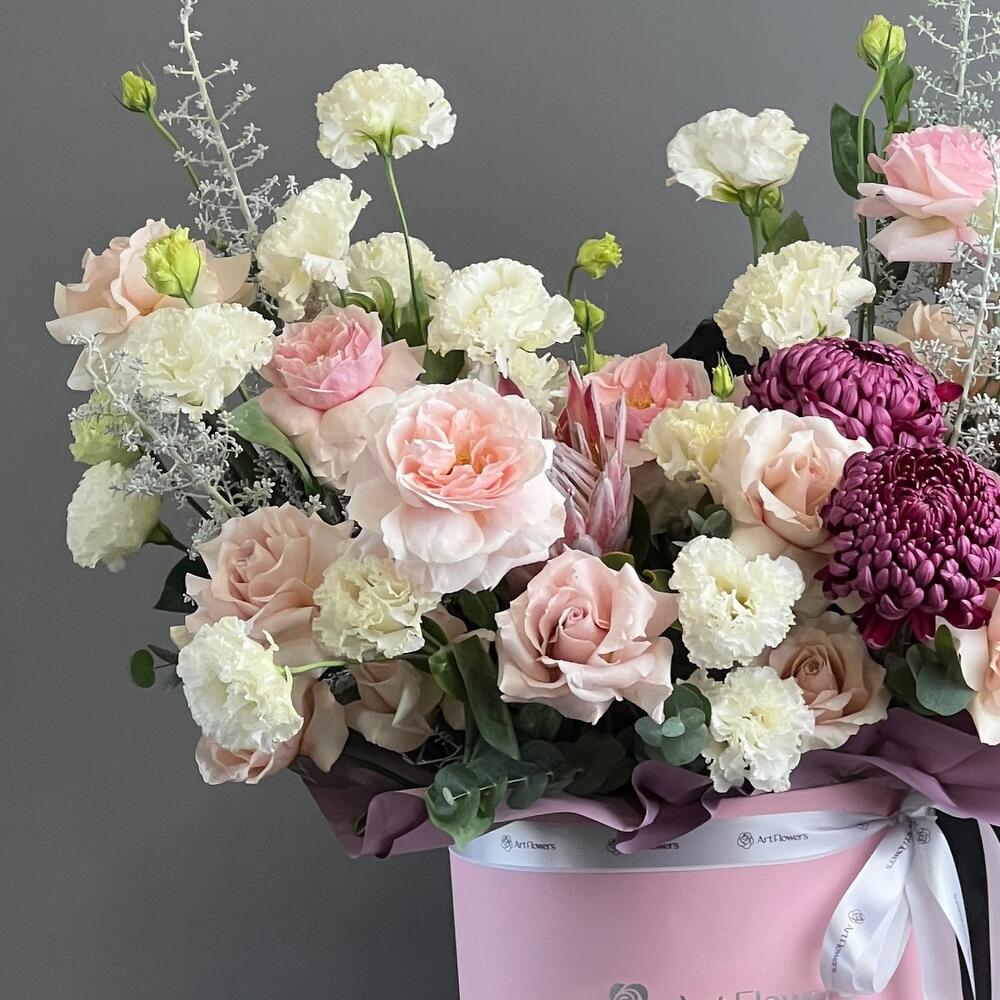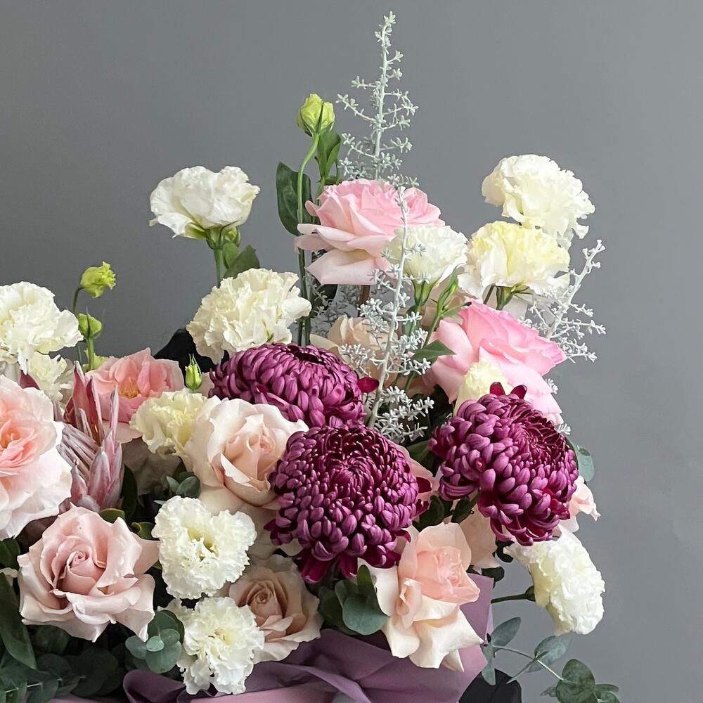 Протея - 1 шт. Эвкалипт - 2 шт. Роза - 17 шт. Коробка - 1 шт. Кохия - 5 шт. хризантемы одноголовые - 3 шт. пионовидные розы - 7 шт. лизиантусы - 7 шт.