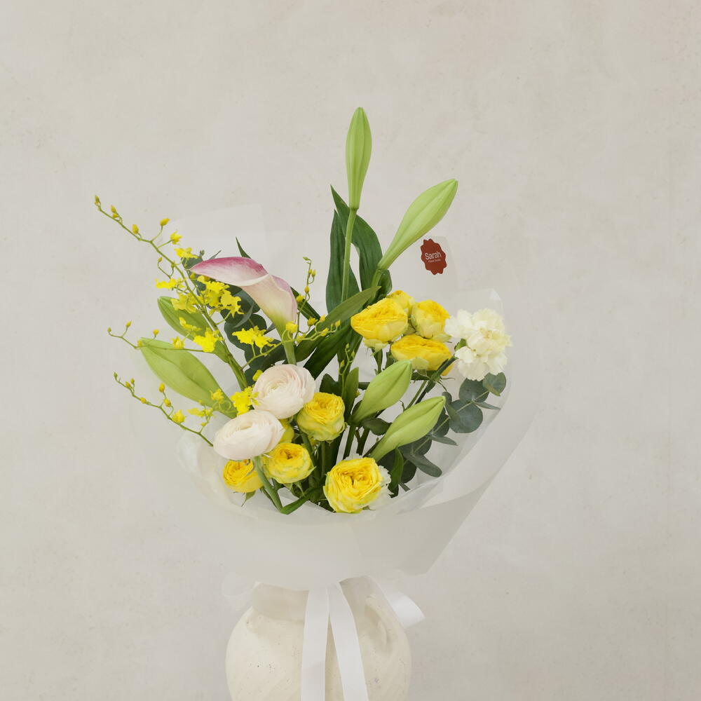 Калла - 1 шт. Лилия - 3 шт. Эвкалипт - 1 шт. Гвоздика - 1 шт. Ранункулюс - 2 шт. Пионовидная кустовая роза - 2 шт. онцидиум - 1 шт.